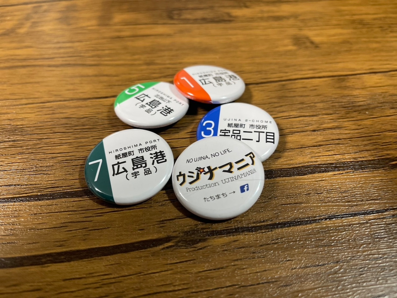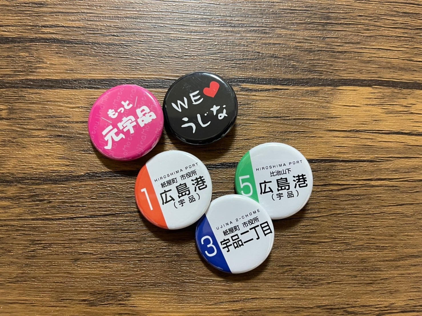 B:「we♡うじな」「もっと元宇品」+「市内電車風バッジ3種」